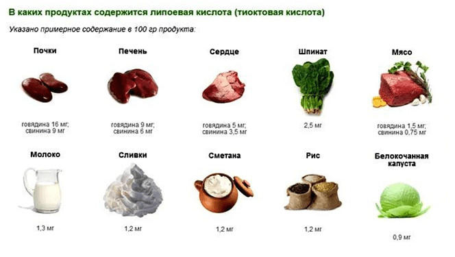 Многие продукты содержат немного альфа-липоевой кислоты. В основном, источником являются овощи – шпинат, брокколи, ямс, картофель, дрожжи, помидоры, брюссельскую капусту, морковь, свеклу и рисовые отруби. Также, содержится и в красном мясе, особенно субпродуктах.