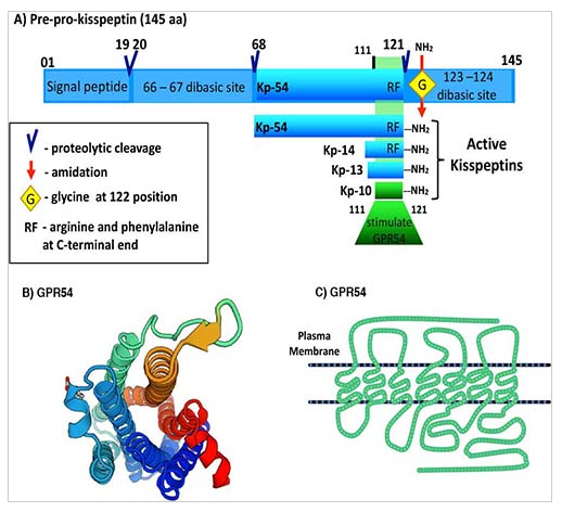 Кисспептин, в совокупности описывающий нейропептиды, отщепленные от его 145-аминокислотного полипептидного предшественника (кодируемого геном KISS1/Kiss1), является ключевым регулятором репродуктивной функции. Существует несколько изоформ с общим концом RF-амида C, включая кисспептин (KP) -54, KP-14, KP-13 и KP-10 (суффикс, обозначающий количество аминокислот), хотя существуют некоторые споры относительно того, в какой степени каждая изоформа присутствует естественным образом [2,3]. Кисспептин является эндогенным лигандом рецептора кисспептина (KISS1R/Kiss1r) [1]. Все изоформы обладают способностью активировать рецептор кисспептина благодаря общей С-концевой декапептидной последовательности, хотя KP-54, по-видимому, является наиболее распространенным пептидным продуктом в кровообращении человека [3].