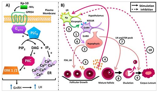 Рис. 3. Клеточная сигнализация Кисспептина/GPR54 и физиологическая роль в менструальном цикле. А) GPR54 и внутриклеточная сигнализация. GPR54 связан с белком Gq/11, когда кисспептин стимулирует его рецептор, Gq/11 активирует фосфолипазу С (PLCβ), которая гидролизует фосфатидилионозитол 4,5-бисфосфат (PIP2), производя вторичные сообщения инозитол 1,4,5-трисфосфат (IP3) и диацилглицерин (DAG). IP3 стимулирует эндоплазматический ретикулум (ER) для мобилизации кальция (Ca2+). Повышение внутриклеточного уровня Ca2+ активирует кальций-зависимые сигнальные пути в нейронах GnRH. DAG активирует кальций-зависимую протеинкиназу С (PKC), которая активирует внеклеточные киназы 1 и 2, регулируемые сигналом (ERK1 и ERK2). Б) Роль кисспептина в пульсе ЛГ. ГнРГ стимулирует гипофиз (1), который высвобождает ФСГ и ЛГ (2), которые стимулируют рост фолликулов и начинают вырабатывать эстрадиол (3). Эстрадиол подавляет гипоталамо–гипофизарно-гонадную систему (3). В поздней фолликулярной фазе, когда основной фолликул достигает увеличения уровня эстрадиола примерно на 12 мм и стимулирует нейроны кисспептина (Kp), которые имеют рецептор эстрадиола (ER), высвобождающий кисспептин (4). Нейроны Kp стимулируют нейроны GnRH (5), которые индуцируют высвобождение ЛГ (7), овуляцию (8) и развитие желтого тела (9). Желтое тело вырабатывает прогестерон, эстрадиол и ингибин А, которые подавляют гипоталамо–гипофизарно–гонадную ось (10). [24].