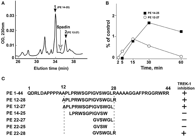 Рис. 1. Профили продуктов распада спадина в сыворотке с помощью ВЭЖХ. (А) Типичный профиль ВЭЖХ, полученный после 30-минутной инкубации спадина с мышиной сывороткой при 37°C. Положение пика спадина указано стрелкой. (B) Кинетика появления пиков 1 (PE 14-28) и 2 (PE 12-27). (C) Последовательности укороченных пептидов и их способность ингибировать активность TREK-1 по сравнению с последовательностями PE и спадина (PE 12-28) [2].