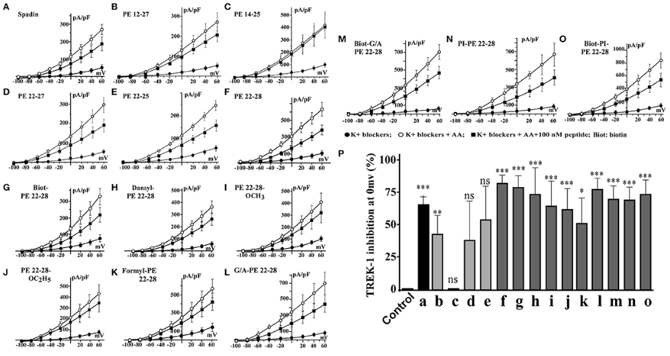 Рис. 2. I = кривые f(V) и % ингибирования TREK-1. (A–F), кривые плотности тока, полученные для спадина и укороченных пептидов, описаны на рисунке 1C. (G–O), кривые плотности тока, полученные для аналогов PE 22-28. (P) Процент ингибирования тока TREK-1, измеренный при 0 мВ для соответствующих пептидов, описанных от “A” до “O”. Контрольное значение было получено с использованием 0,9% раствора NaCl. ns, незначительное. *p < 0,05, **p < 0,01, ***p <0,001 [2].