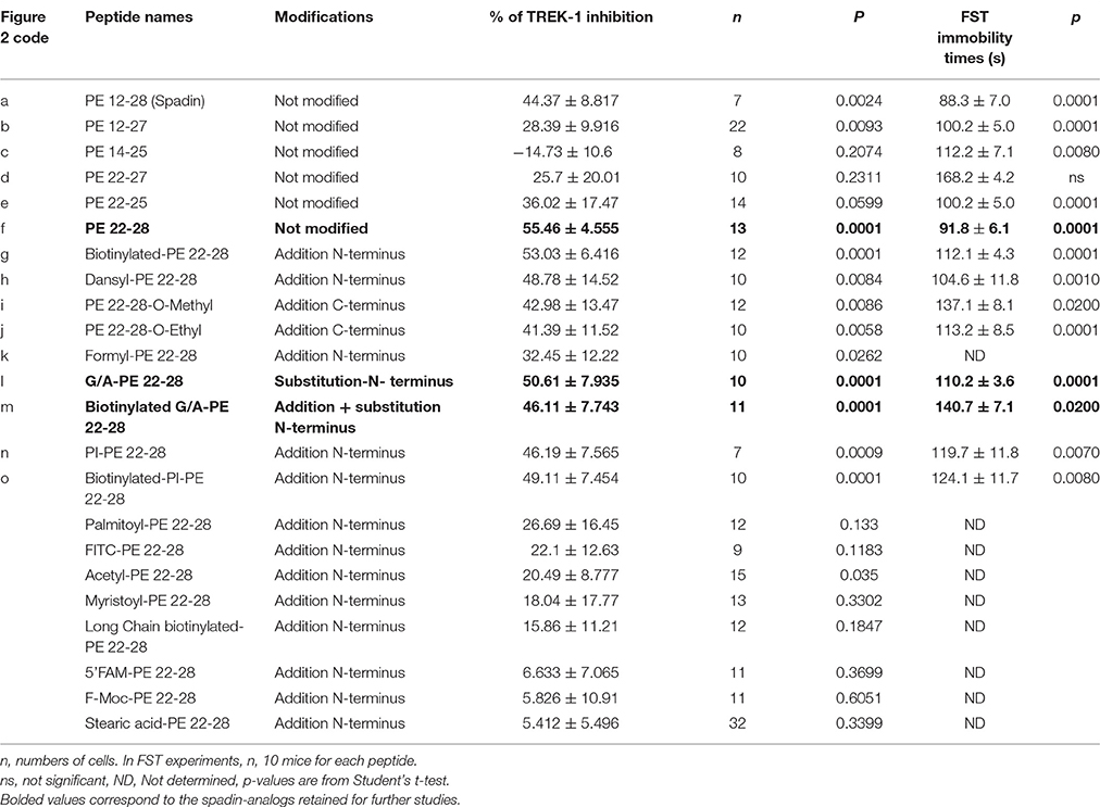 Затем было принято решение поискать укороченные аналоги. Сначала ученые изучили, разрушается ли спадин в кровообращении, в свзяи с чем, были идентифицированы два укороченных пептида [2]. Сравнивая их способность ингибировать канал TREK-1, экспрессируемый в клеточной линии hTREK-1 / HEK [13], была идентифицирована самая короткая эффективная последовательность, которая содержала только 7 аминокислот, называемая PE 22-28. Этот пептид использовали в качестве основной последовательности для получения аналогов путем химической модификации его N-или С-концевых окончаний, а также путем замены аминокислот. Как и PE 22-28, некоторые модифицированные пептидные аналоги проявляли лучшую эффективность в блокировании канала TREK-1 и, что более важно, они сохранили свои свойства при лечении депрессии при использовании в момент острой или субхронической формы.