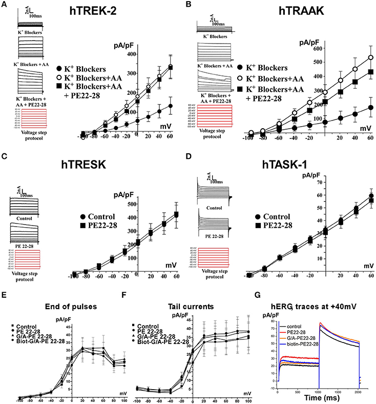 Рис. 4. Специфичность аналогов спадина. (A–D) PE 22-28 использовали в качестве репрезентативного пептида для тестирования специфичности аналогов спадина по сравнению с другими каналами K2P, TREK-2 (A), TRAAK (B), TRESK (C) и TASK-1 (D). (E-G) Аналоги спадина не влияли на активность канала hERG. Плотности тока в конце импульсов (E), плотности тока в хвостовых токах (F) и типичные следы, полученные при +40 мВ с аналогами спадина (G) [2].