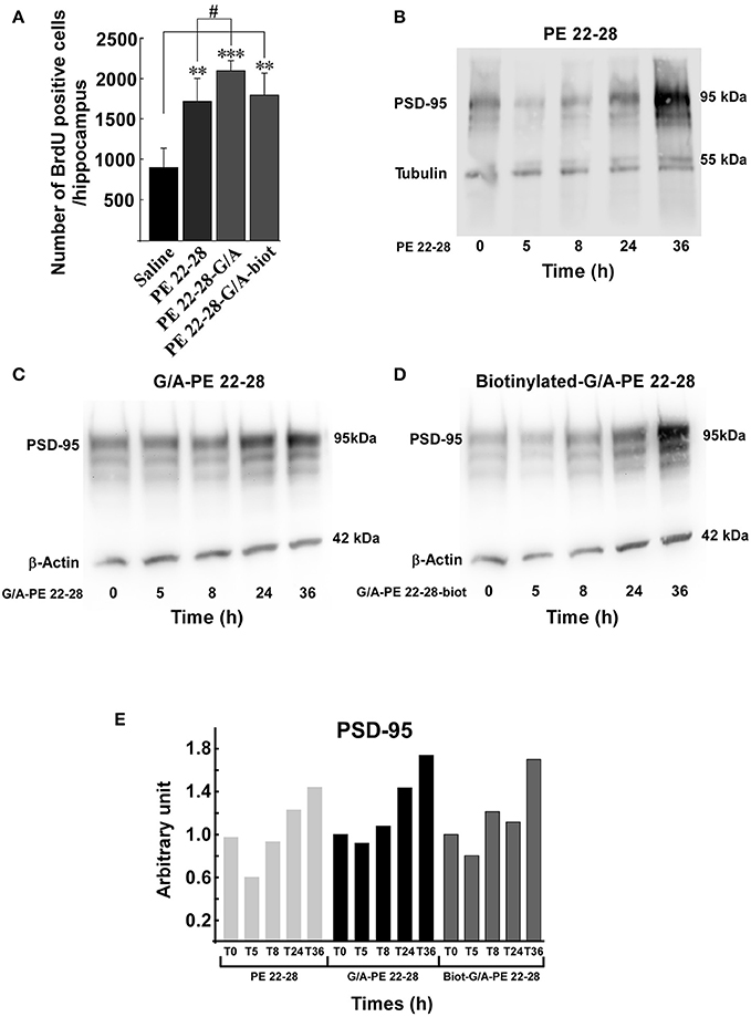 Рис. 6. Рисунок 6. Нейрогенез и синаптогенез. (A) Нейрогенез оценивали путем измерения количества BrdU-позитивных клеток в гиппокампе после субхронического лечения (3,0–4,0 мкг/кг, 4 дня) аналогами спадина. Количество клеток было указано для всего гиппокампа. **p <0,01, ***p <0,001, #p <0,05. (B–D) Синаптогенез оценивали путем измерения увеличения уровня PSD-95 в нейронах коры головного мозга мыши. Нейроны коры головного мозга мышей обрабатывали 0,1 мкм указанного аналога спадина PE 22-28 (B), G/A-PE 22-28 (C) и биотинилированным G/A-PE 22-28 (D). В указанные сроки нейроны гомогенизировали в буфере Laemmli и подвергали вестерн-блоттингу. (E) Иллюстрация гистограммы PSD-95. Для каждого аналога спадина количество PSD-95 через 36 ч было примерно в два раза больше, чем измеренное через 5 ч [2].