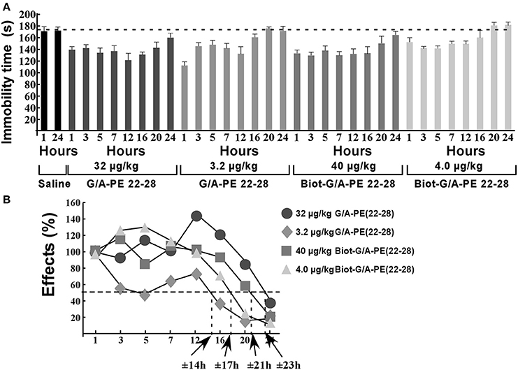 Рис. 7. Продолжительность действия G/A-PE 22-28 и биотинилированного G/A-PE 22-28 измеряется методом FST. (A) В каждый момент времени 10 наивных мышей тестировали на неподвижность в FST. Мышей, которым вводили физиологический раствор, тестировали только два раза, через 1 и 24 часа. Для каждого аналога спадина на момент времени 1 ч разница между мышами, получавшими физиологический раствор, и мышами, получавшими аналог спадина, считалась равной 100%, время неподвижности на момент времени было нормализовано до этого 100% значения. (B) Эффекты периода полураспада составляли приблизительно 14, 21, 17 и 23 ч для 3,2 мкг/ кг G/A-PE 22-28, 32 мкг/ кг G/A-PE 22-28, 4,0 мкг/ кг биотинилированного G/A-PE 22-28 и 40 мкг / кг биотинилированногоG/A-PE 22-28 соответственно.