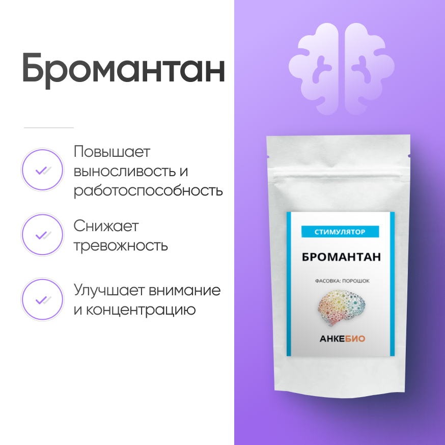 Несмотря на стимулирующий эффект, бромантан снижает беспокойство. Это уникальная особенность, потому что подавляющее большинство стимуляторов связано с усилением тревоги, особенно в высокой дозе. Препарат использовался солдатами советской армии для улучшения физических и умственных способностей и сокращения времени восстановления после упражнений.
