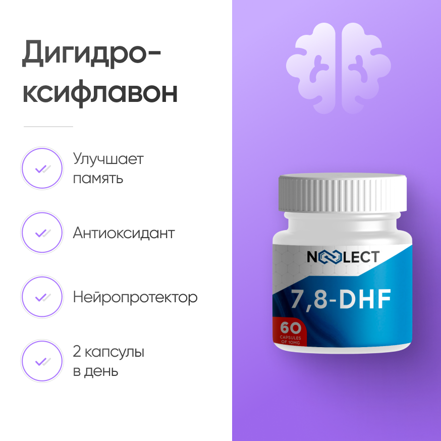 Флавоноид дигидроксифлавон открыт во время поиска веществ, имитирующих работу БДНФ или нейротрофического фактора мозга. Главной особенностью этих молекул является способность ускорять процессы роста нейронов и синапсов. В ходе клинических испытаний ученые установили, что вещество способно облегчить симптомы болезней Альцгеймера и Паркинсона, а также шизофрении. 7,8-DHF снижает образования амилоидных бляшек, уменьшает воздействие окислительного стресса и предотвращает потерю синапсов. Поэтому препарат рекомендуют для улучшения мышления и памяти, а также для профилактики деменции у пожилых людей.