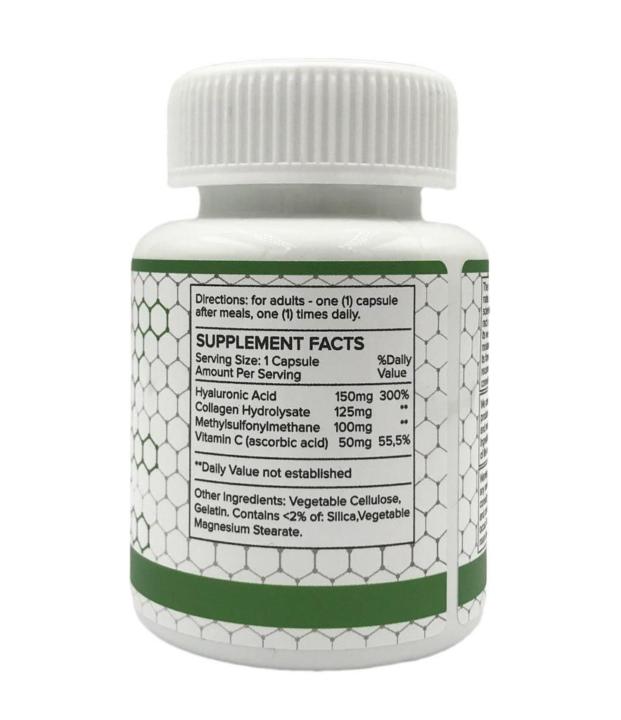 Состав: 150 мг гиалуроновой кислоты, 125 мг коллагена, 100 мг метилсульфонилметана, 50 мг витамина С.