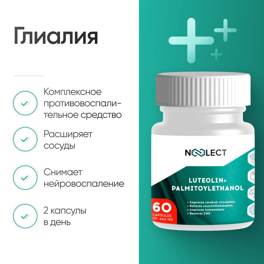 Глиалия — это комплексная пищевая добавка, содержащая в своей основе ПЕА (пальмитоилэтаноламид) и лютеолин. Препарат создан с целью обезболивания и снятия воспаления любого типа. В составе добавки присутствуют лютеолин (40 мг) и пальмитоилэтаноламид (400 мг), заключенные в целлюлозную капсулу. Указанная добавка считается веганским продуктом.