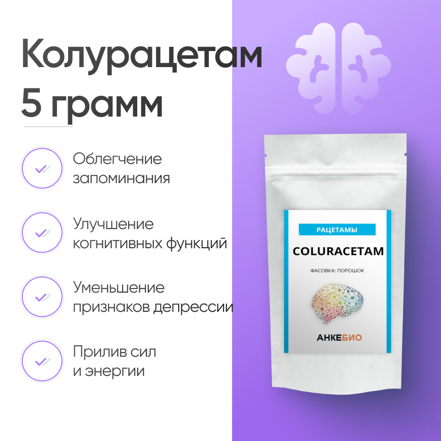 Порошок Колурацетам (Coluracetam) 5 грамм — мощное синтетическое ноотропное средство группы рацетамов. Повышает способность концентрироваться на важных делах, улучшает память, стабилизирует настроение и купирует приступы тревоги. Отличается высокой эффективностью и безопасностью, сочетается со многими ноотропами. В ложке без горки 50 мг.