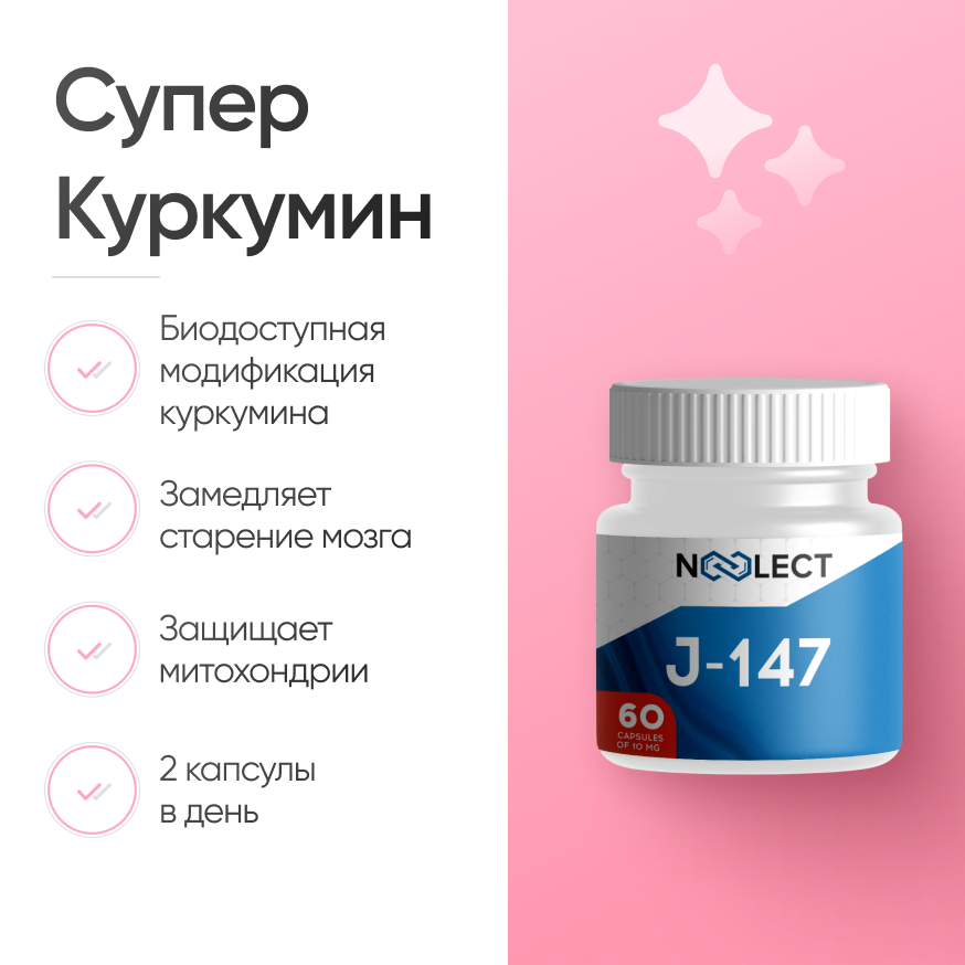 J-147– современный экспериментальный препарат, разработанный для улучшения познавательных функций мозга и замедления процесса старения клеток. J-147 получен из куркумина. На фармацевтическом рынке препарат нередко предлагается в виде капсул, каждая объемом 10 мг.