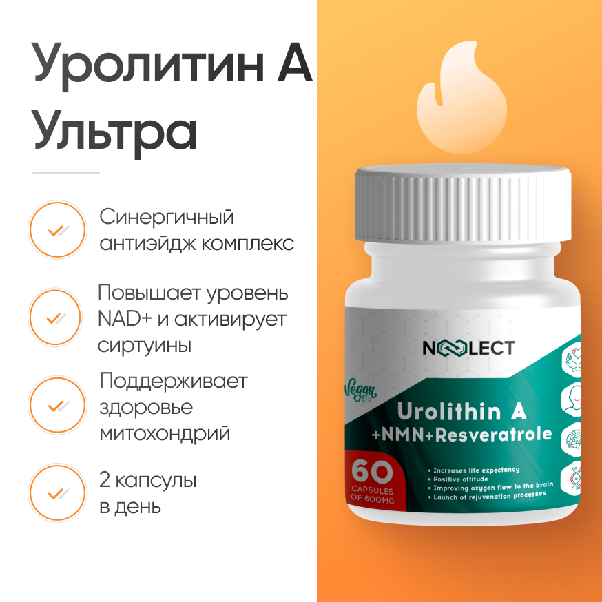 Уролитин А Ультра — комплексный препарат из Уролитин А 250мг + НМН 250мг+Ресвератрол 50мг. Выделен в процессе обмена веществ из кишечного микробиома в результате трансформации эллаговой кислоты и эллагитанинов кишечными бактериями.