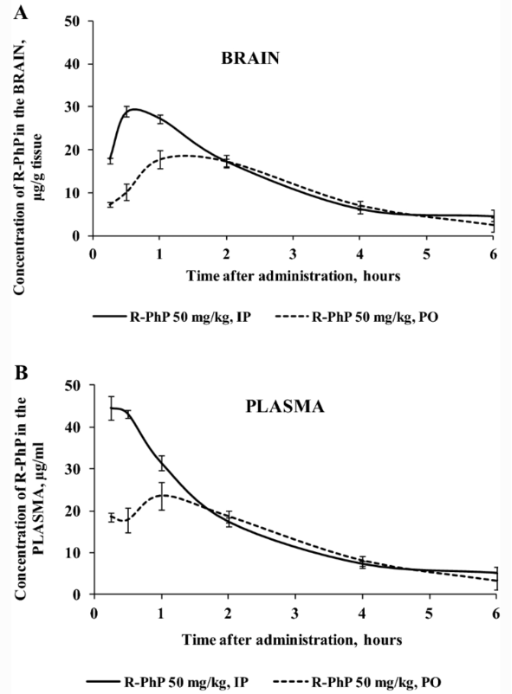 2) Первоначальные результаты исследования, проведенного Звейниеце и др., показали, что R-фенилпирацетам способен проникать через гематоэнцефалический барьер. Соединение обнаруживалось в образце мозговой ткани примерно через 15 минут после однократной пероральной или внутрибрюшинной инъекции. R-фенилпирацетам достигал пиковых концентраций в мозге через 30–60 минут после внутрибрюшинной инъекции и через 60–120 минут после перорального введения. После пероральной и внутрибрюшинной инъекции соединения максимальные концентрации R-фенилпирацетама в тканях мозга составляли 28 мкг/г и 18 мкг/г соответственно. Через 24 часа соединение больше не обнаруживалось в образцах тканей. Что касается образцов плазмы, R-фенилпирацетам обнаруживался через 15 минут после однократной пероральной и внутрибрюшинной инъекции. Максимальная концентрация соединения в плазме была выявлена через 15-30 минут после однократной внутрибрюшинной инъекции и через 60 минут после перорального введения. Эти зарегистрированные времена коррелировали с максимальной концентрацией 45 мкг/мл после внутрибрюшинной инъекции и 24 мкг/мл после перорального введения. Через 24 часа R-фенилпирацетам все еще обнаруживался в плазме на уровне 0,05 мкг/мл как при пероральном, так и при внутрибрюшинном введении [3].