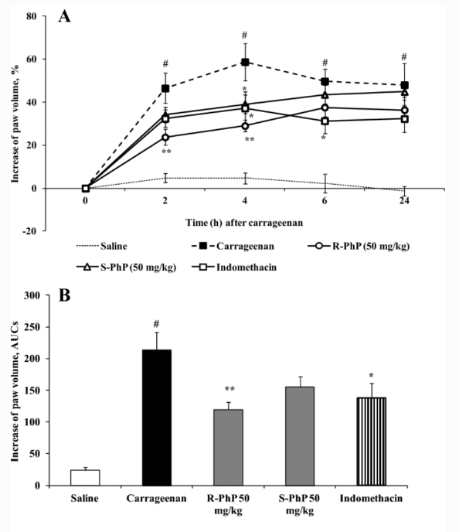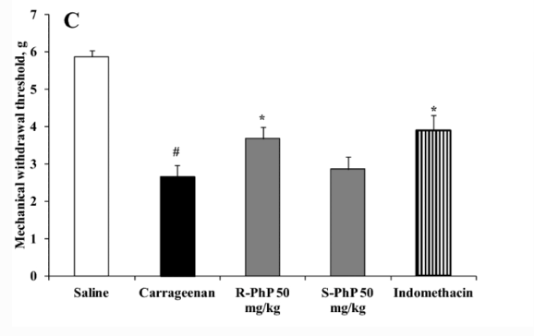 Отек лапы измерялся по увеличению размера лапы из-за воспаления, вызванного интраплантарной инъекцией каррагинана. Было показано, что каррагинан значительно увеличивает случаи отека лапы в зависимости от времени по сравнению с контрольной группой, получавшей физиологический раствор. Эти результаты были подтверждены двухфакторным статистическим анализом с повторными измерениями ANOVA, который показал зависящее от времени ослабление отека, вызванного каррагинаном. При введении в дозах 50 мг/кг было показано, что R-фенилпирацетам значительно уменьшает отек лапы через 2, 4 и 6 часов после инъекции каррагинана на 60%, 40% и 45% соответственно. Дозы соединения 10 мг/кг и 25 мг/кг не уменьшали объем лапы. Было показано, что доза индометацина 10 мг/кг уменьшает отек лапы через 4 и 6 часов после инъекции каррагинана на 36% и 45% соответственно. Эти результаты были подтверждены двусторонним дисперсионным анализом с повторными измерениями, который подтвердил, что введение как R-фенилпирацетама, так и S-фенилпирацетама в дозе 50 мг/кг снижало образование отека в ответ на инъекцию каррагинана.