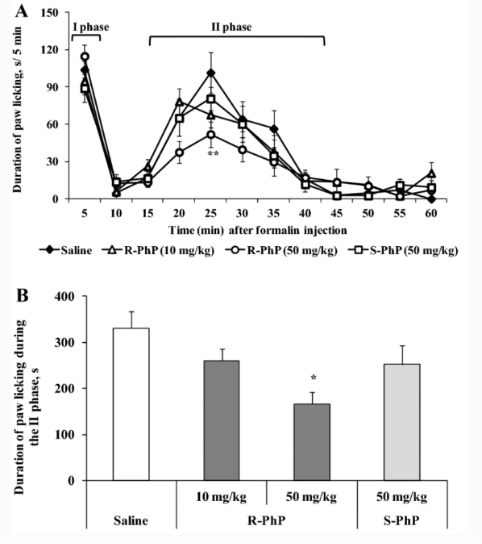 Перед началом теста на облизывание лап, вызванное формалином, животные получали перорально либо физиологический раствор, R-фенилпирацетам в дозах 10 и 50 мг/кг, либо дозу 50 мг/кг S-фенилпирацетама в течение 7 дней. На 7-й день испытуемым вводили препараты, а затем через 60 минут делали интраплантарную инъекцию формалина в объеме 30 мкл в правую заднюю лапу. Затем мышей помещали в камеру для наблюдения из плексигласа, в то время как общее время облизывания задней лапы для каждого испытуемого регистрировалось с помощью секундомера. Записанное время затем количественно оценивалось в последующих 5-минутных интервалах в течение 60-минутного периода. Первая фаза теста длилась 5 минут и начиналась с немедленной регистрации времени, потраченного на облизывание, в то время как вторая фаза теста длилась приблизительно 35-40 минут и начиналась через 15-20 минут после инъекции формалина [3].